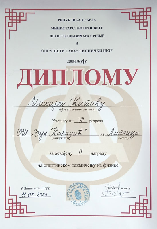 Дана 11.2.2023. године на Општинском такмичењу из физике одржаном у ОШ „Свети Сава“ у Липничком Шору, Михајло Катић, ученик седмог разреда освојио је друго место.