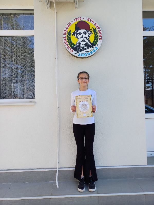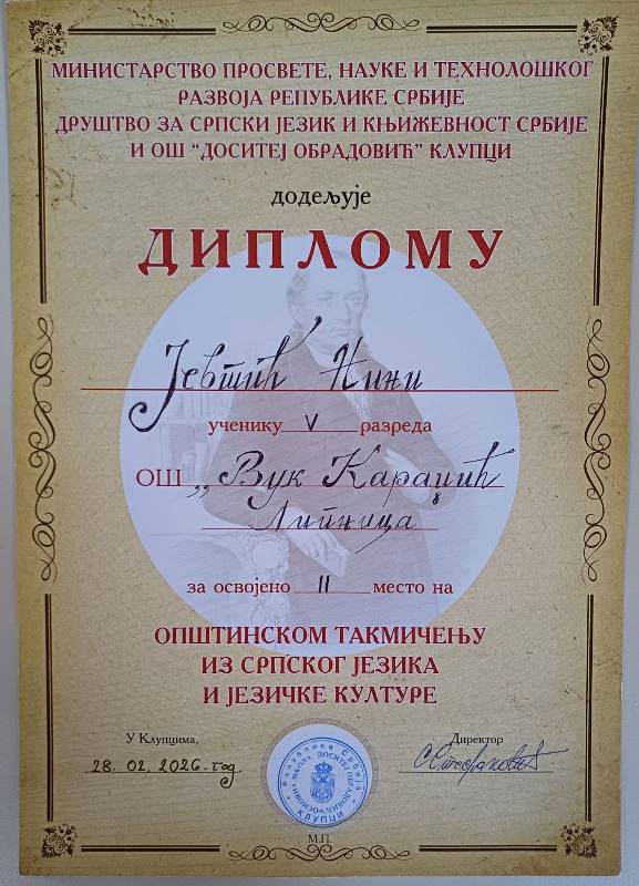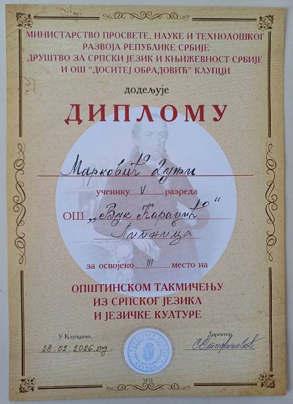 На Општинском такмичењу из српског језика и језичке културе одржаном 28.2.2026. године у ОШ „Доситеј Обрадовић“ у Клупцима наше ученице петог разреда оствариле су велики успех: Нина Јевтић друго место, а Дуња Марковић треће место.