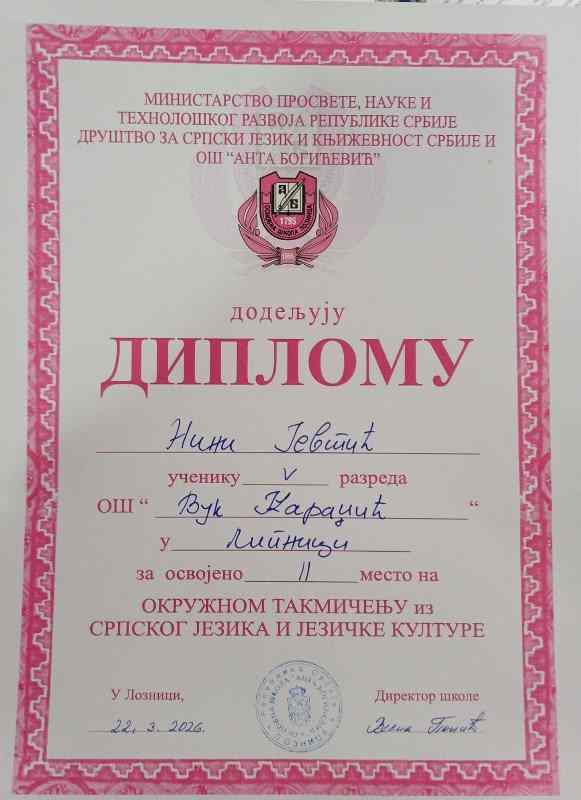 На Окружном такмичењу из српског језика и језичке културе одржаном 22.3.2026. године у ОШ „Анта Богићевић“ у Лозници, Нина Јевтић, ученица петог разреда освојила је друго место. Првог места није било. Једина је и најбоља била са 18 поена.